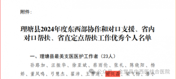 【喜报】我院谢兴磊医生载誉归来!获评“理塘县最美支医医护工作者”,中医技术高原结硕果! 近日,中共理塘县委办公室下发《关于表扬2024年度东西部协作和对口支援、省内对口帮扶、省直定点帮扶工作优秀个人的通报》(理委办〔2025〕33号)通报表彰一批对口...