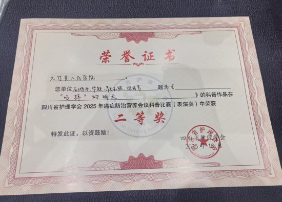 为进一步促进癌症防治营养教研与临床结合,提高四川省癌症防治营养专业水平,10月17日,四川省护理学会在成都市举办了2025年癌症防治营养会议。在本次会议举办的科普比赛上,大竹县人民医院科普团队营养专业支持护理小组凭借卓越的实力和优秀的表现,荣获了本次科普比赛(表演类)二等奖,是唯一进入决赛并获得奖项的县级医院。
