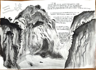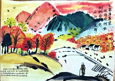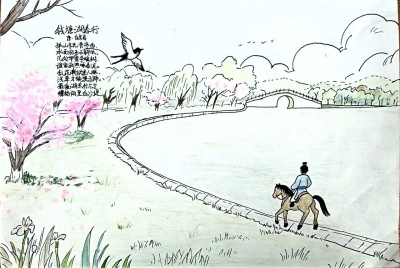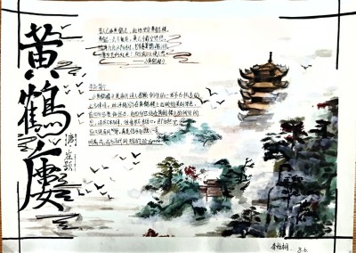 同学们的作品可谓异彩纷呈、各有千秋。有的作品以《三峡》“重岩叠嶂,隐天蔽日”为灵感,用层叠的墨色勾勒出两岸连山的巍峨;有的以《使至塞上》“大漠孤烟直,长河落日圆”为灵感,用苍劲的线条与暖黄的色调,勾勒出大漠的雄浑与孤寂、长河落日的壮美;有的将《钱塘湖春行》“乱花渐欲迷人眼,浅草才能没马蹄”的意境化作缤纷的色彩、绚丽的画面;还有的作品以《答谢中书书》“高峰入云,清流见底”为蓝本,用挺拔的线条与澄澈的色调,捕捉山川的峻秀与清朗;更多的作品是以细腻工笔表现《黄鹤楼》中的“昔人已乘黄鹤去,此地空余黄鹤楼”的奇幻与怅惘……