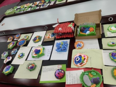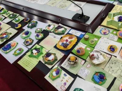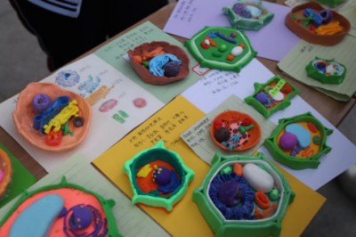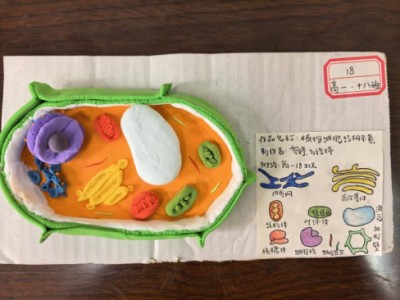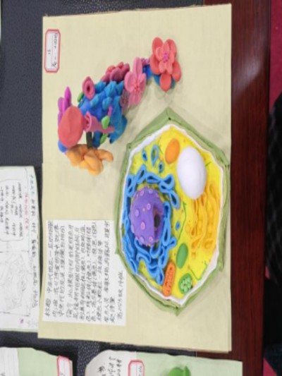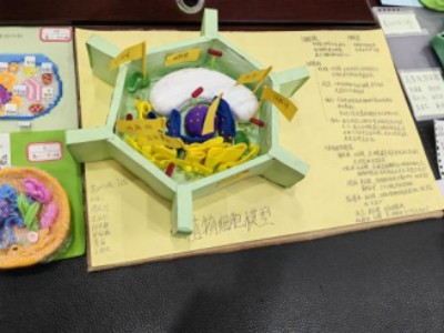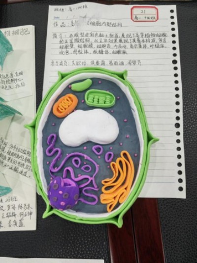 以橡皮泥为基质,纸张为架构,同学们在一掌之间的微观世界里,再现了真核细胞的生动形态。色彩柔和的橡皮泥精心塑形成细胞核、线粒体、叶绿体;轻薄的纸张经过剪裁与折叠,化作内质网、高尔基体与细胞膜。每一处弧度、每一片层叠、每一笔勾画,都凝聚着同学们对细胞结构的细致观察与巧妙还原。