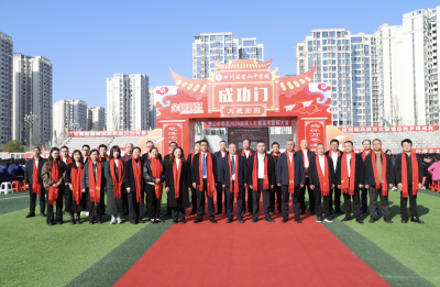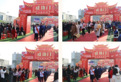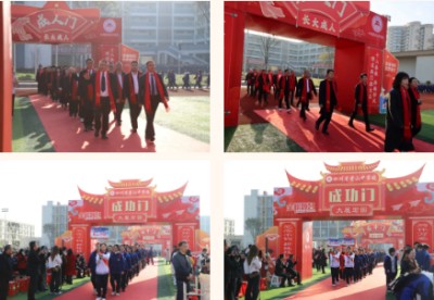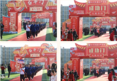 上午八时三十分,在《年轻的战场》《我们都是追梦人》等励志暖场音乐的烘托下,大会正式拉开序幕。高三年级各班学子与家长携手并肩,依次缓步迈过象征成长与跨越的“成人门”“奋斗门”“成功门”。校领导与教师代表伫立门侧,向每一位经过的学子挥手致意、加油鼓劲,传递着学校的关怀与师长的期许。红毯之上,亲子紧握的双手传递着无言的支持,门下学子目光坚定,映照出对成年的庄重体悟与冲刺高考的坚定决心。这一路,既是告别少年时代的成长跨越,亦是开启奋斗征程的崭新起点。