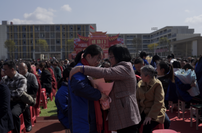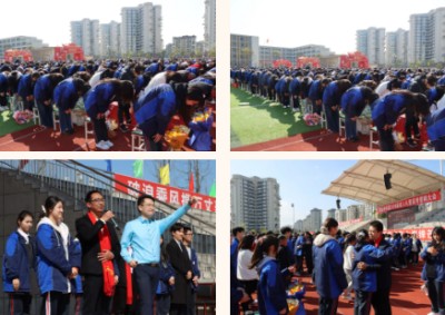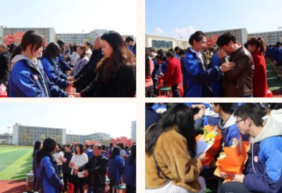 宣誓礼成,大会进入核心环节——冠笄之礼。家长与学子面对面而立,亲手为孩子佩戴上象征祝福的幸运手环与徽章,寄托着父母对子女成年的美好祝愿,亦饱含对孩子高考圆梦的殷切期许。随后,学子们面向父母行九十度三鞠躬拜谢礼:一鞠躬,感念养育之恩;二鞠躬,答谢教诲之苦;三鞠躬,致敬陪伴之情。鞠躬瞬间,亲情涌动,不少家长与孩子热泪盈眶。亲子间互换饱含深情的书信与卡片,纸短情长,道不尽的是爱与期许。运动场上温情弥漫,感人至深。