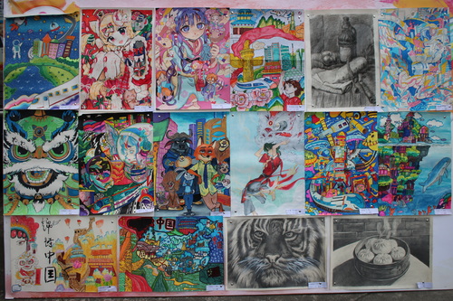 艺术节期间,书法、作文、绘画、英语、手抄报、手工小制作等创作成果精彩亮相!展览区里,各种风格的艺术作品争奇斗艳,这些作品凝聚着同学们的智慧与热情,是青春最鲜活的注脚。一幅幅笔墨酣畅的书法作品、一张张色彩绚丽的绘画作品,或描绘祖国大好河山,或致敬革命先烈,尽显学生们的艺术才情与爱国情怀。